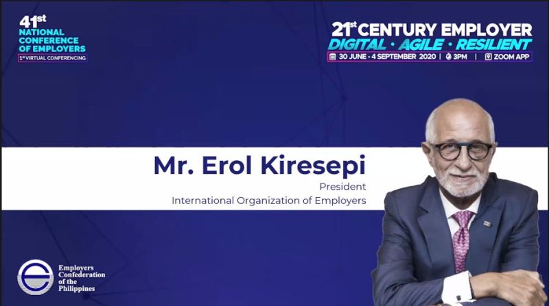 Mr Erol Kiresepi, Chairman of Santa Farma İlaç Sanayii A.Ş., Deputy President of KİPLAS and President of International Organisation of Employers (IOE), took the stage for the opening speech at the Conference entitled “21st Century Employer: Transitioning to New and Flexible Ways of Doing Business and Work” which was organised by the Employers Confederation of the Philippines (ECOP) on September 4, 2020. During the online meeting held with the participation of Representatives from ITUC and ILO as well as H.E. Rodrigo Duterte, President of the Republic of the Philippines, the attendees focused on social and economic policies which are required for supporting employers in terms of digitalization, agility and resilience in this new epoch in the global arena.