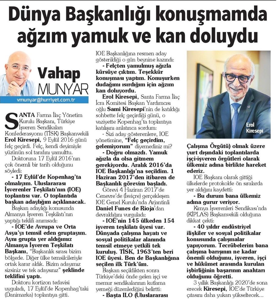 Vahap Munyar, columnist in Hürriyet newspaper, wrote about the address of Mr Erol Kiresepi, the President of Santa Farma, on account of his nomination to be elected as the new President of IOE (International Organisation of Employers).