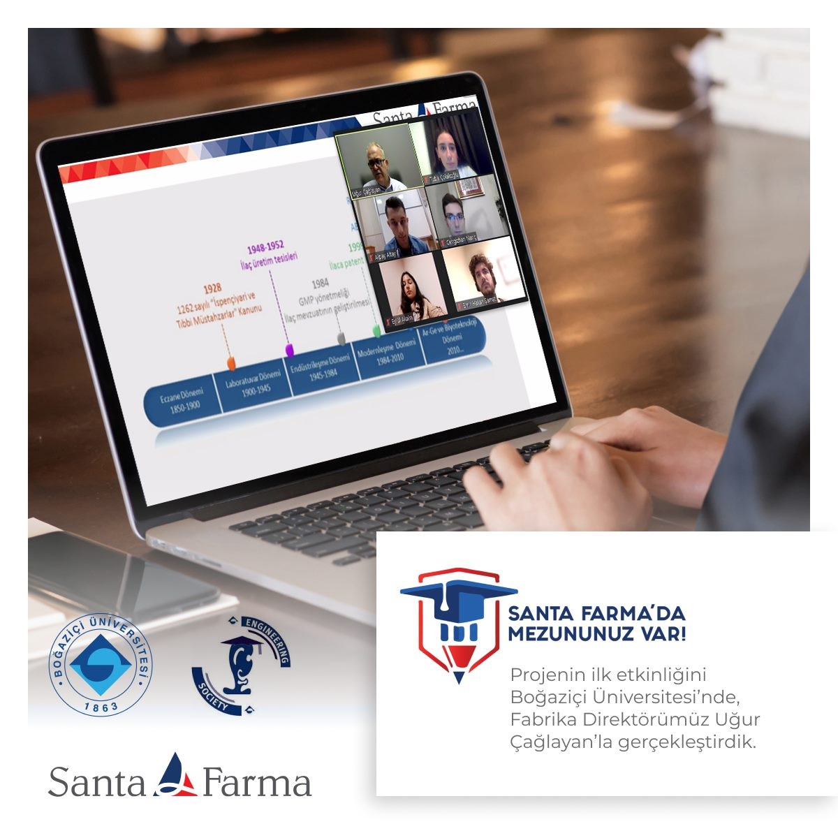 Santa Farma’da Mezununuz Var! projesinin ilk etkinliğini Boğaziçi Üniversitesi’nde, Fabrika Direktörümüz Uğur Çağlayan’la gerçekleştirdik. Boğaziçi Üniversitesi Kimya Mühendisliği mezunu Uğur Çağlayan, mühendislik topluluğu, kimya kulübü ve kimya mühendisleri fakültesi öğrencilerinin katılımıyla organize edilen etkinlikte kendi hikayesini öğrencilerle paylaştı, öğrencilere tecrübelerini ve önerilerini aktardı.