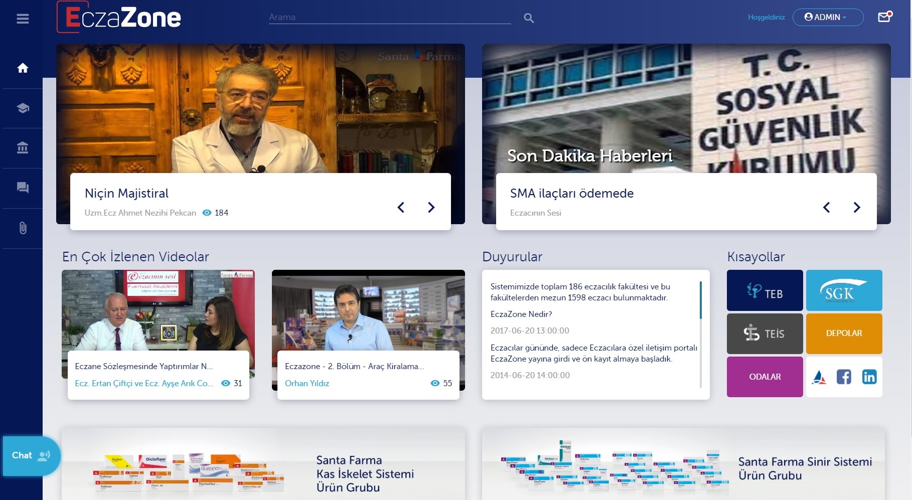 Türkiye’nin en köklü ilaç firmaları arasında yer alan Santa Farma, eczacıların doğru bilgi, haber ve eğitim materyallerine diledikleri yerden, diledikleri anda ulaşabilmelerini sağlayan EczaZone portalını hizmete açtı. Eczacıların ihtiyaçlarına uygun olarak tasarlanan ve eczazone.com adresinden ulaşılabilen portal, ilaçlara ilişkin yapım ve kullanım bilgilerini geliştirmek isteyen eczacılık profesyonelleri için hazırlandı. “Chat” ve “Fakülteden” özellikleriyle anlık tekil veya grup mesajlaşma imkanı sunan EczaZone, eczacıların mezun oldukları fakültelerdeki arkadaşları ve eczaneleri hakkında bilgi alabileceği, iletişim kurabilecekleri bir ana portal olma hedefiyle yola çıktı.