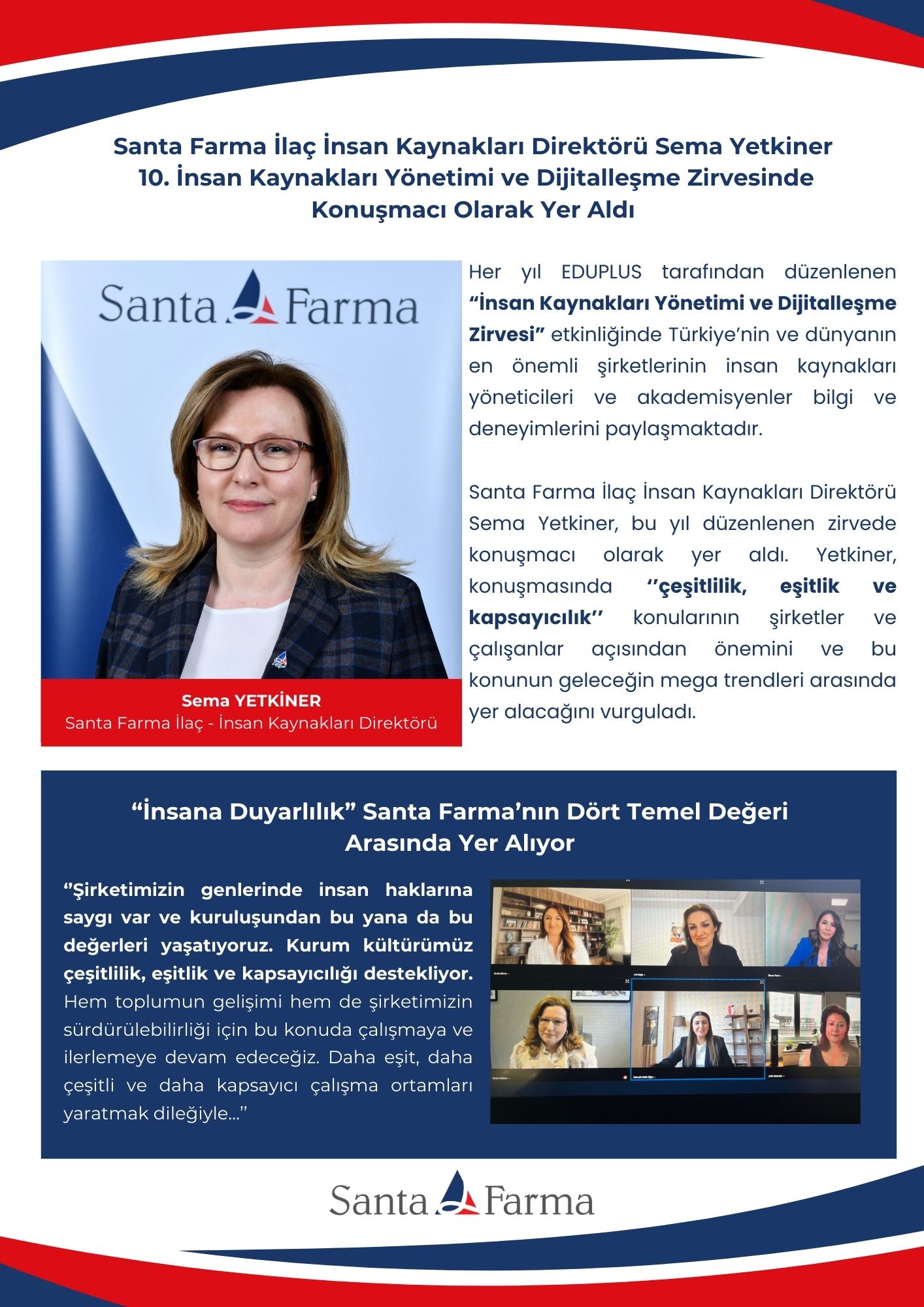 Sema Yetkiner, ‘’İnsana Duyarlılık’ın Santa Farma’nın dört temel değeri arasında olduğunu ifade etti. Bu değerin tanımının ise; ’’insan haklarını gözetmek‘’ cümlesi ile başladığını belirtti. Santa Farma’nın genlerinde insan haklarına saygının olduğunu ve kuruluşundan bu yana da bu değerleri yaşattıklarını ifade etti. Mevcut kurum kültürünün çeşitlilik, eşitlik ve kapsayıcılığı desteklediğini belirtti.
