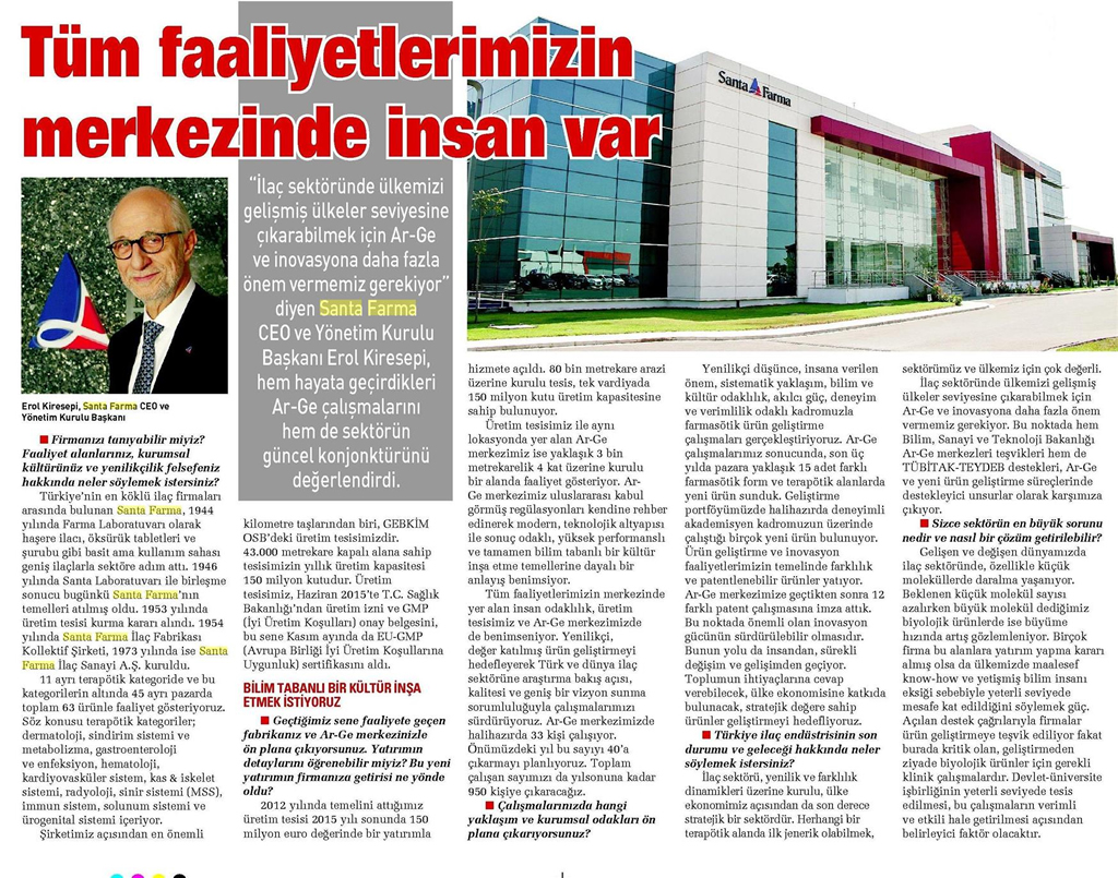 İlaç sektöründe ülkemizi gelişmiş ülkeler seviyesine çıkarabilmek için Ar-Ge ve inovasyona daha fazla önem vermemiz gerekiyor" diyen Santa Farma CEO ve Yönetim Kurulu Başkanı Erol Kiresepi, hem hayata geçirdikleri Ar-Ge çalışmalarını hem de sektörün güncel konjonktürünü değerlendirdi.